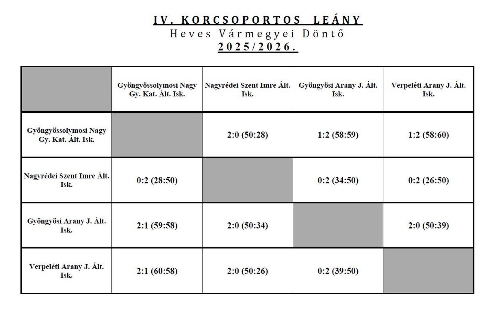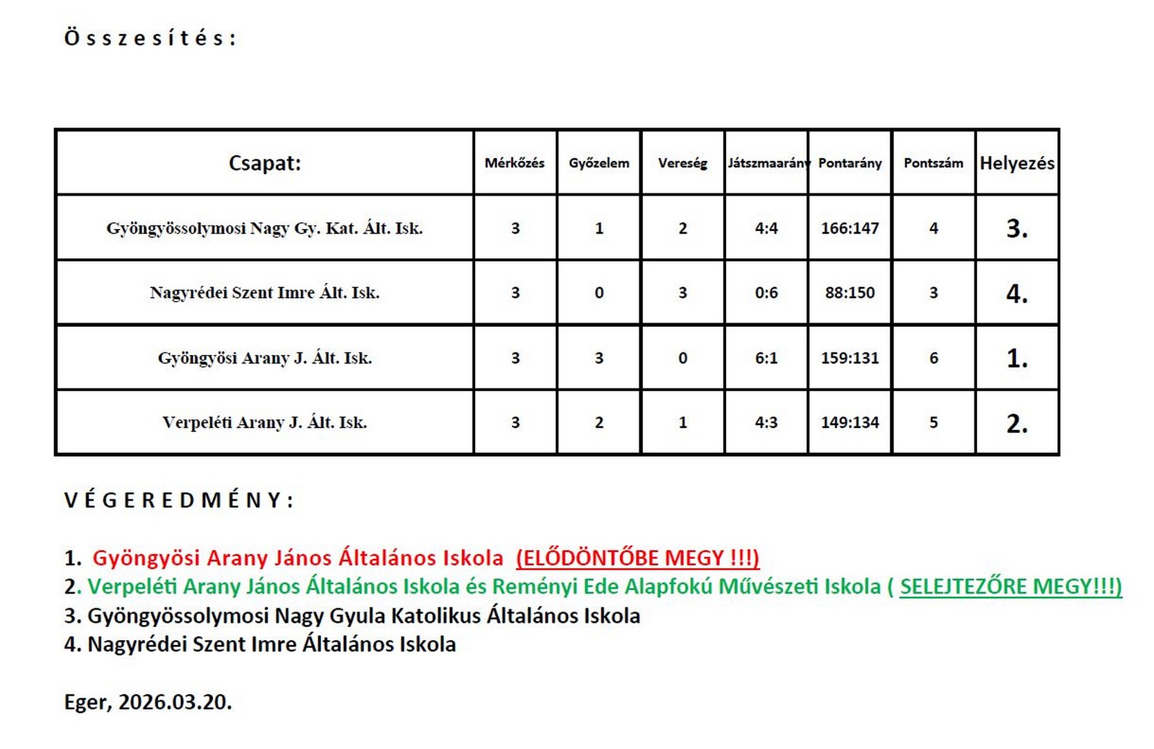 Február 27-én, hazai pályán rendeztük a röpisek következő megmérettetését. A két csoport első két helyezett csapatai mérték össze tudásukat egymással. Detki Petőfi Sándor Általános Iskola, Gyöngyösi Arany János Általános Iskola, Kemény Ferenc Sportiskola Eger és a mi lányaink. Óriási küzdelemben, két mérkőzésen is 3 játszmában maradtunk alul Detk és az Arany ellen.