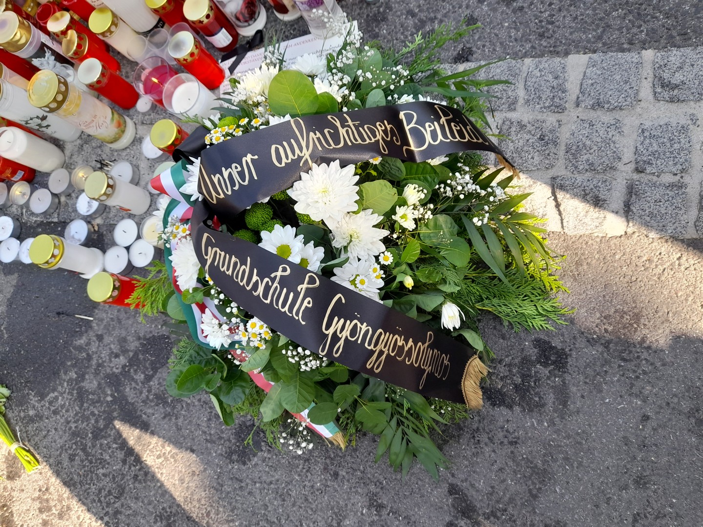 Bár a labda volt a középpontban a nap folyamán, azért a rendezvényt beárnyékolta a keddi grazi merénylet, amelyben több diák is életét vesztette. Emberbaráti kötelességünknek éreztük, hogy iskolánk nevében koszorút helyezzünk el az ottani intézmény előtt létesített emlékfalnál.