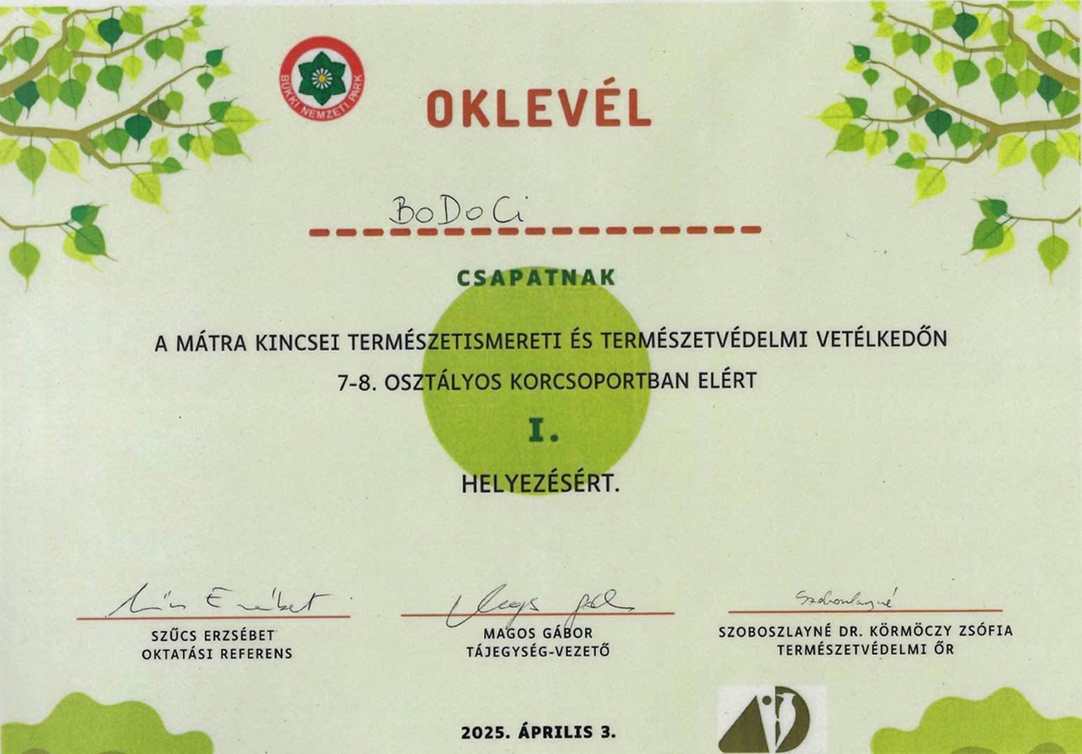 Iskolánk 3 fős csapata 2025. április 3-án részt vett a Mátra Kincsei természetismereti vetélkedőn. A versenyt a Bükki Nemzeti Park Igazgatóság mátrafüredi Harkály Ház természetiskolája szervezte.